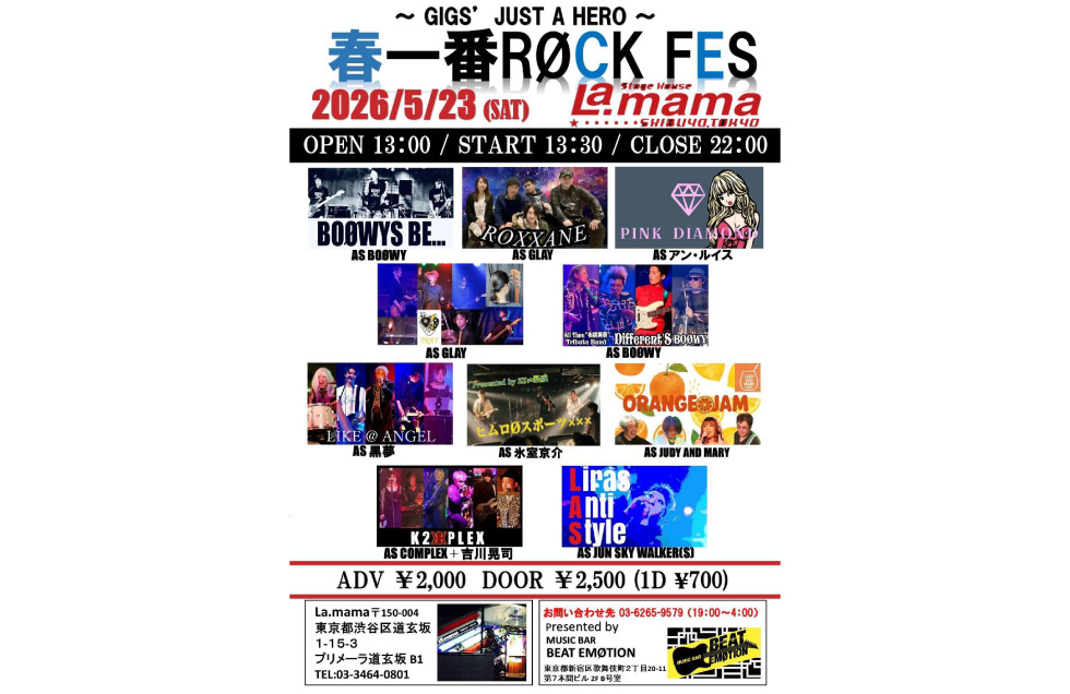 SCHEDULE 04 2026 05 06 05/ 23 SAT 春一番 RØCK FES 渋谷Lamama BOØWYS BE… / ROXXANE / PINK DIAMOND / TRAY / Different’S BOØWY / LIKE@ANGEL / ヒムロØスポーツ✕✕✕ / ORANGE☆JAM / K2PLEX / Liras Anti Style NEXT MONTH PICK UP 06/ 11 THU 「turn over」 竹縄航太