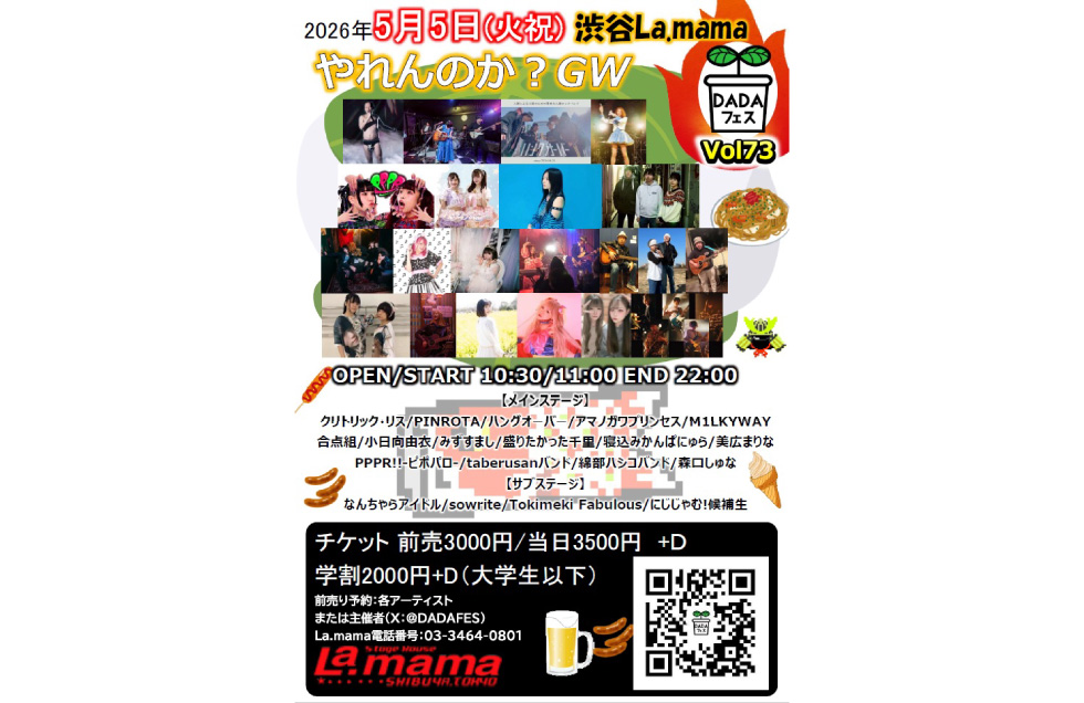クリトリック・リス / M1LKYWAY / 小日向由衣 / ハングオーバー / みずすまし / 盛りたかった千里 / 寝込みかんぱにゅら / PINROTA / 美広まりな / アマノガワプリンセス / PPPR!!-ピポパロ- / taberusanバンド / 合点組 / 綿部ハシコバンド / 森口しゅな /【サブステージ】なんちゃらアイドル / sowrite / Tokimeki Fabulous / にじじゃむ!候補生